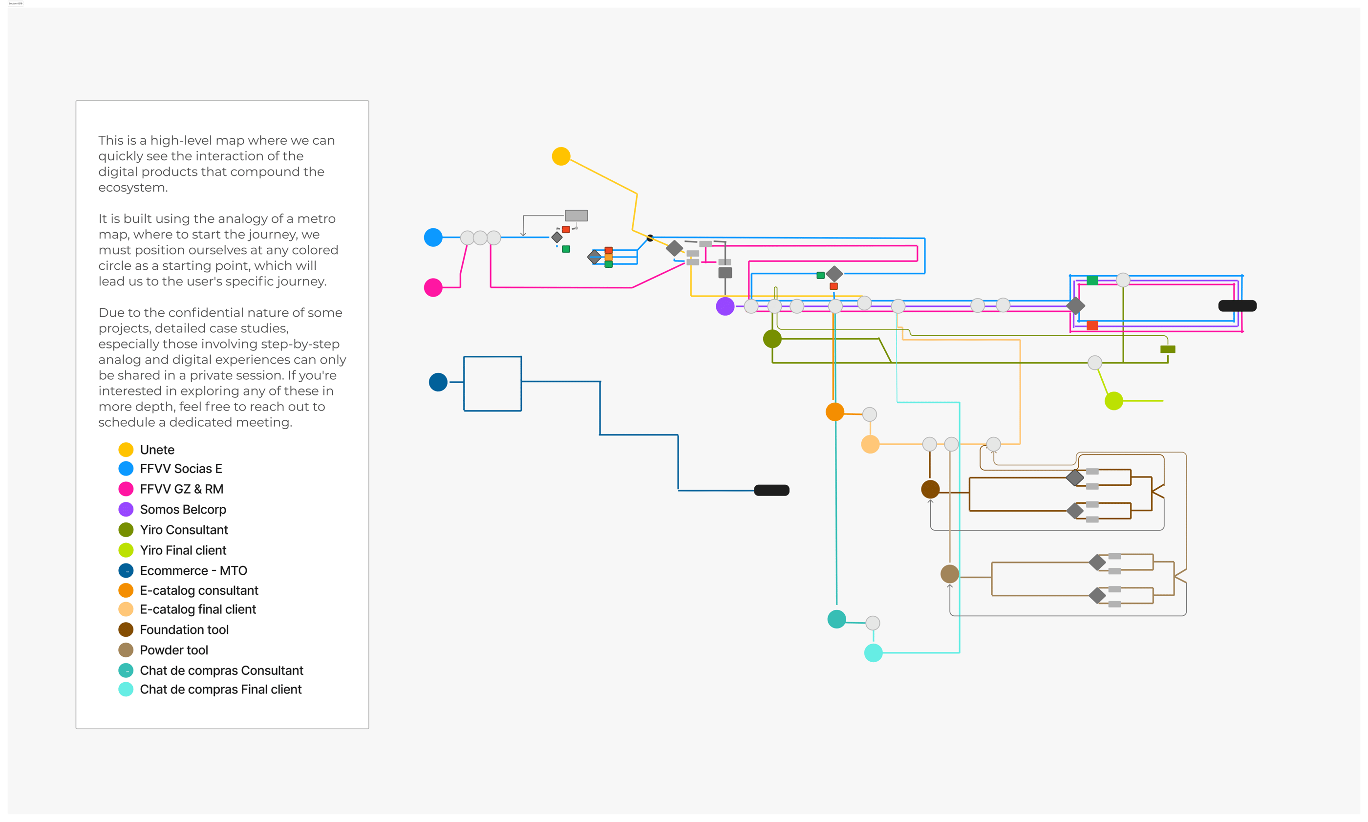 Belcorp’s digital experience is made up of multiple platforms - Unete, FFVV, ISA, Somos Belcorp, E-catalog, each evolving on its own. Service design and UX research mapped the entire consultant journey and the internal workflows behind it, revealing disconnects, duplications, and critical points of saturation. This mapping made it possible to build shared understanding and prioritize changes that benefit the entire experience.